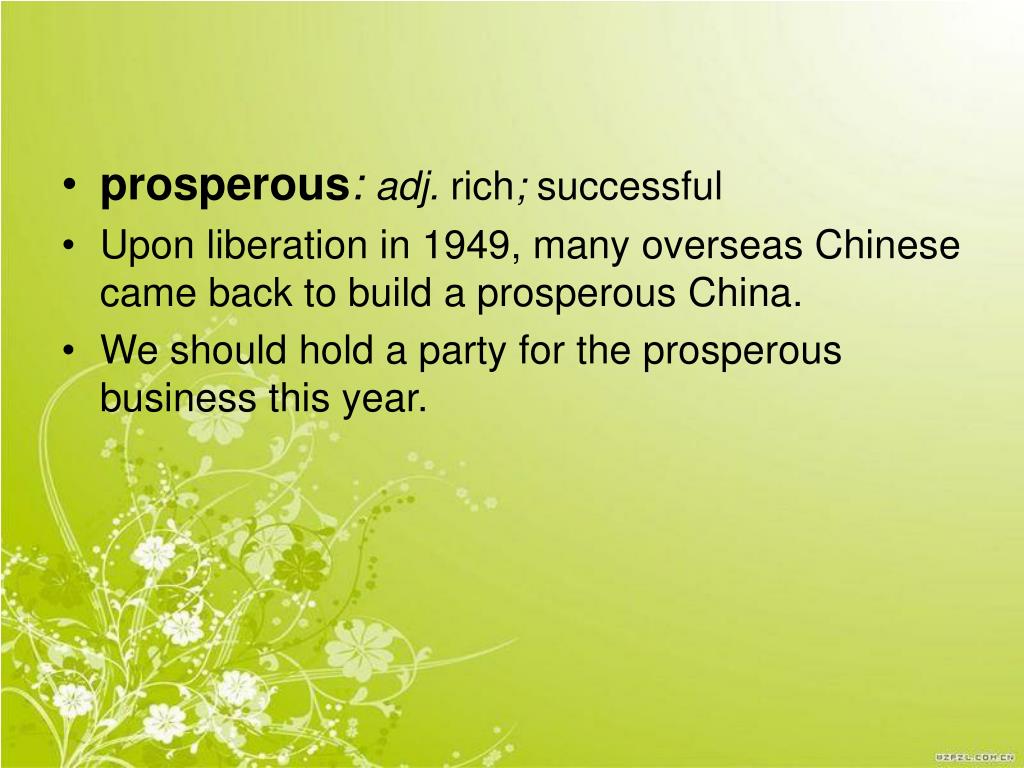 prosperous: adj. rich; successful • Upon liberation in 1949, many overseas Chinese came back to build a prosperous China. • We should hold a party for the prosperous business this year.