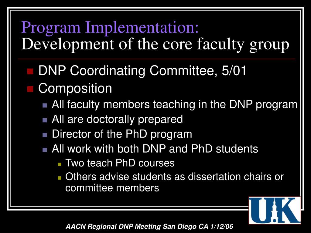 Program Implementation:Development of the core faculty group • DNP Coordinating Committee, 5/01 • Composition • All faculty members teaching in the DNP program • All are doctorally prepared • Director of the PhD program • All work with both DNP and PhD students • Two teach PhD courses • Others advise students as dissertation chairs or committee members AACN Regional DNP Meeting San Diego CA 1/12/06