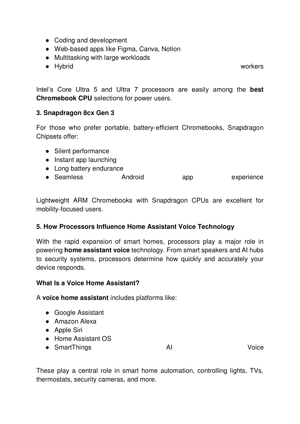 ● Coding and development ● Web-based apps like Figma, Canva, Notion ● Multitasking with large workloads ● Hybrid workers Intel’s Core Ultra 5 and Ultra 7 processors are easily among the best Chromebook CPU selections for power users. 3. Snapdragon 8cx Gen 3 For those who prefer portable, battery-efficient Chromebooks, Snapdragon Chipsets offer: ● Silent performance ● Instant app launching ● Long battery endurance ● Seamless Android app experience Lightweight ARM Chromebooks with Snapdragon CPUs are excellent for mobility-focused users. 5. How Processors Influence Home Assistant Voice Technology With the rapid expansion of smart homes, processors play a major role in powering home assistant voice technology. From smart speakers and AI hubs to security systems, processors determine how quickly and accurately your device responds. What Is a Voice Home Assistant? A voice home assistant includes platforms like: ● Google Assistant ● Amazon Alexa ● Apple Siri ● Home Assistant OS ● SmartThings AI Voice These play a central role in smart home automation, controlling lights, TVs, thermostats, security cameras, and more.