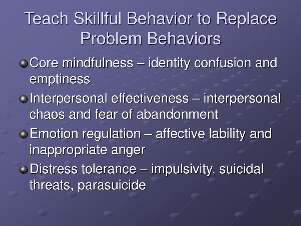 Teach Skillful Behavior to Replace Problem Behaviors • Core mindfulness – identity confusion and emptiness • Interpersonal effectiveness – interpersonal chaos and fear of abandonment • Emotion regulation – affective lability and inappropriate anger • Distress tolerance – impulsivity, suicidal threats, parasuicide
