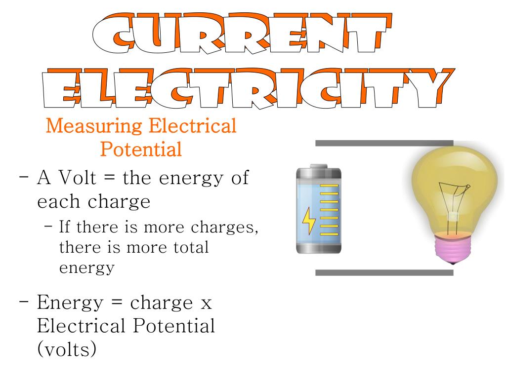 current electricity Current Electricity Measuring Electrical Potential • A Volt = the energy of each charge • If there is more charges, there is more total energy • Energy = charge x Electrical Potential (volts)