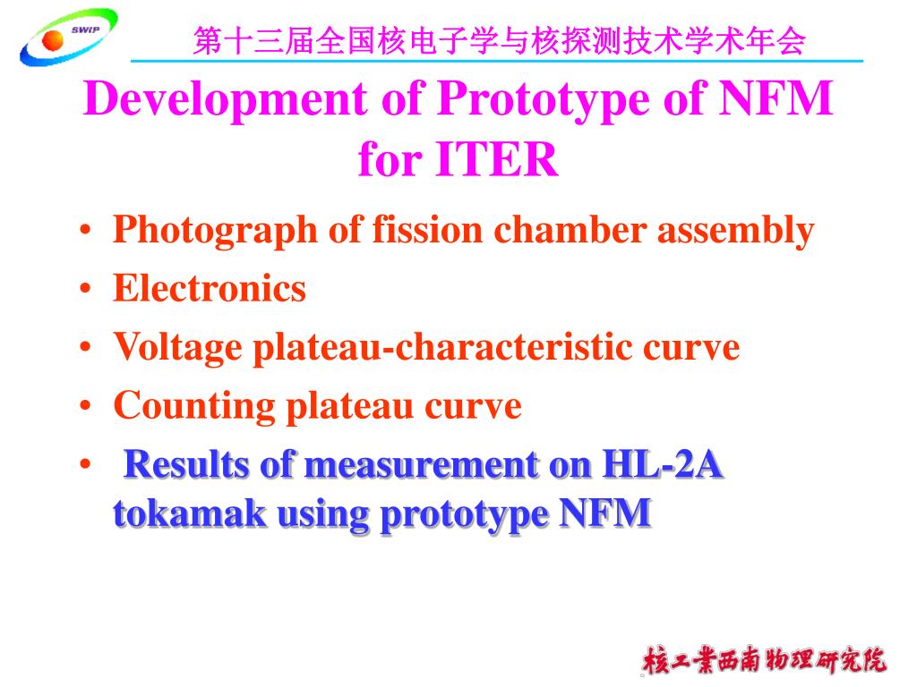 Introduction of International Thermal-nuclear Experiment Reactor (ITER) Development status of nuclear fusion in China Development status of NFM MCNP calculations Detail design for NFM Calibration neutron source Primary neutron detectors for comparision calibration Micro-fission chamber development for Neutronics and trillium production-test blanket module Plan and summary Outline of talk