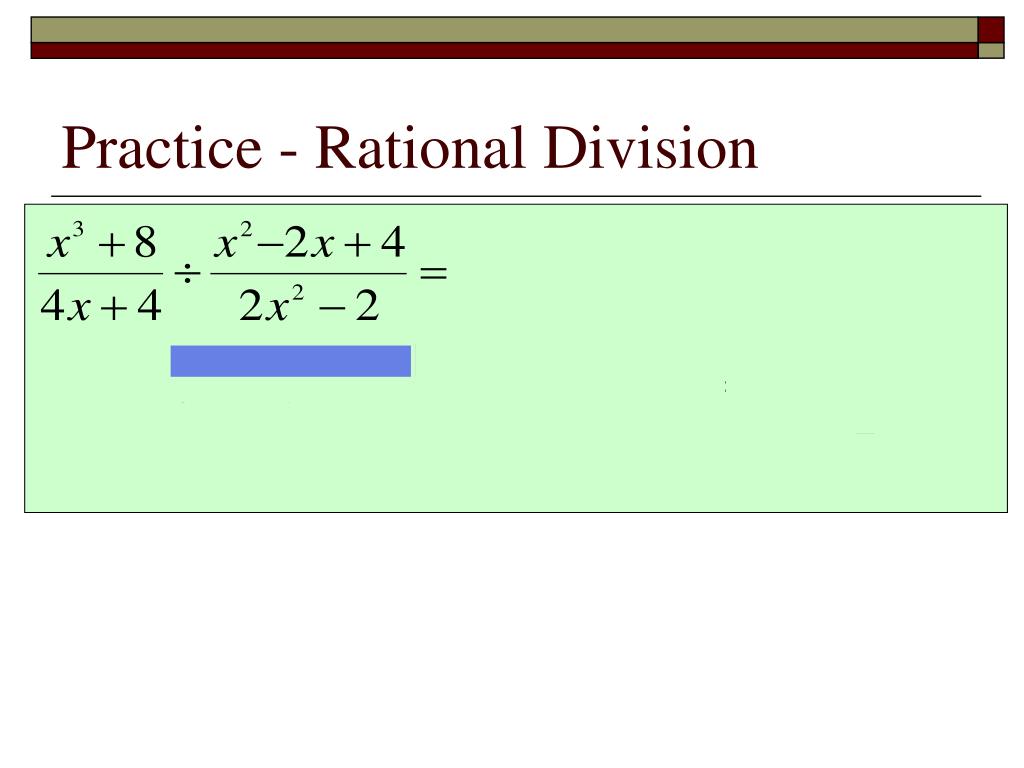 Practice - Rational Division • Write down original problem1a. Rewrite as multiplication by reciprocal • Combine with parenthesized polynomials • Factor polynomials (if possible) • Rewrite (if any factoring was done) • Cancel out matching factors • Simplify the answer