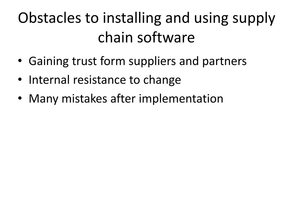 Obstacles to installing and using supply chain software • Gaining trust form suppliers and partners • Internal resistance to change • Many mistakes after implementation