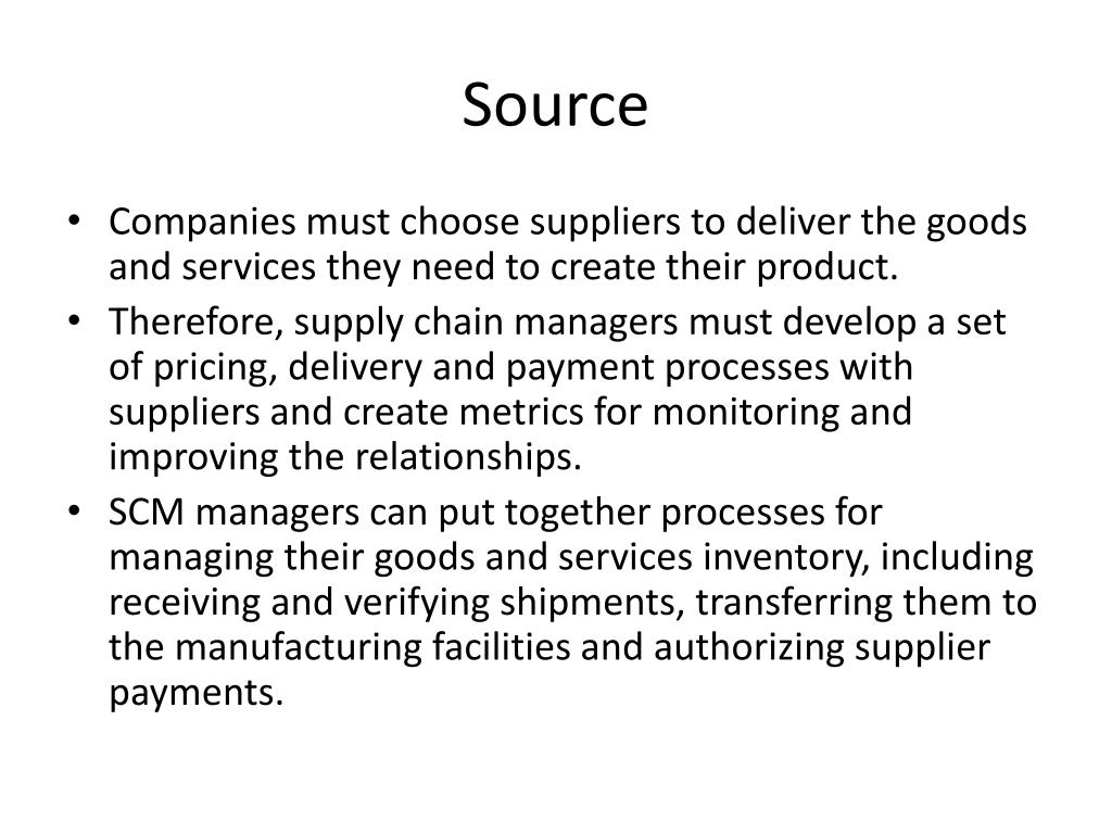 Source • Companies must choose suppliers to deliver the goods and services they need to create their product. • Therefore, supply chain managers must develop a set of pricing, delivery and payment processes with suppliers and create metrics for monitoring and improving the relationships. • SCM managers can put together processes for managing their goods and services inventory, including receiving and verifying shipments, transferring them to the manufacturing facilities and authorizing supplier payments.