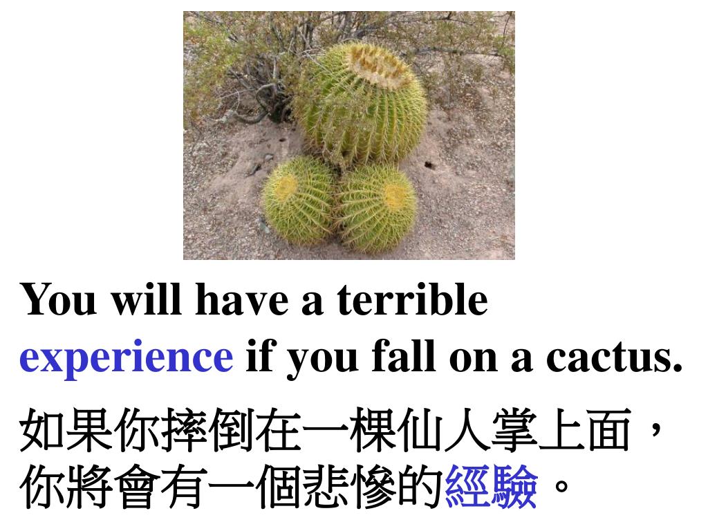 You will experience pain if you fall on a cactus. 如果你摔倒在一棵仙人掌上面,你將會體驗到痛。
