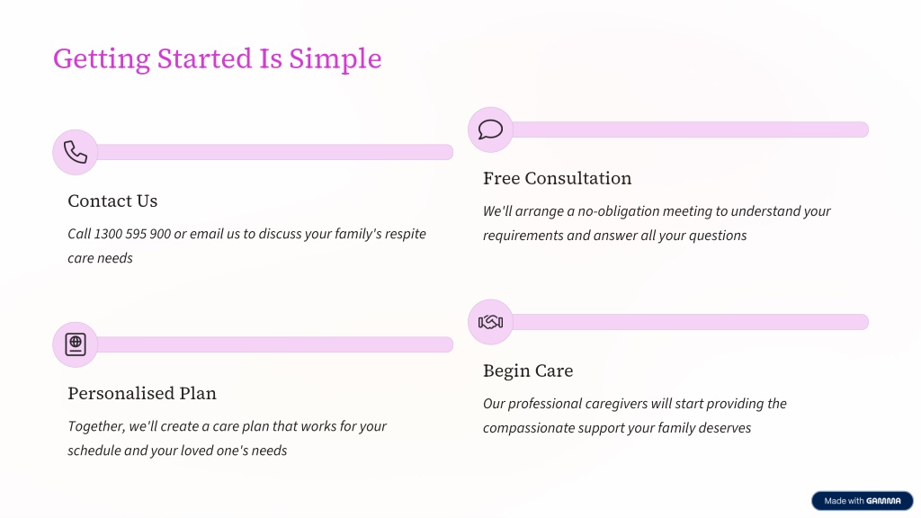 8. Getting Started Is Simple Free Consultation Contact Us We'll arrange a no-obligation meeting to understand your requirements and answer all your questions Call 1300 595 900 or email us to discuss your family's respite care needs Begin Care Personalised Plan Our professional caregivers will start providing the compassionate support your family deserves Together, we'll create a care plan that works for your schedule and your loved one's needs