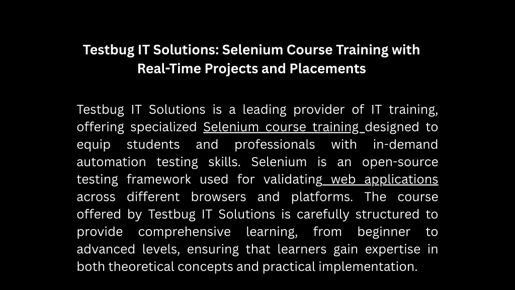 Testbug IT Solutions: Selenium Course Training with Real-Time Projects and Placements Testbug IT Solutions is a leading provider of IT training, offering specialized Selenium course training designed to equip students and professionals automation testing skills. Selenium is an open-source testing framework used for validating web applications across different browsers and platforms. The course offered by Testbug IT Solutions is carefully structured to provide comprehensive learning, advanced levels, ensuring that learners gain expertise in both theoretical concepts and practical implementation. with in-demand from beginner to