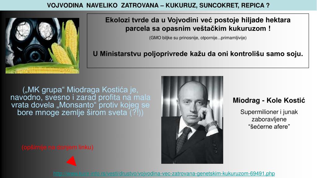 VOJVODINA NAVELIKO ZATROVANA – KUKURUZ, SUNCOKRET, REPICA ? Ekolozi tvrde da u Vojvodini već postoje hiljade hektaraparcela sa opasnim veštačkim kukuruzom ! (GMO biljke su prinosnije, otpornije...primamljivije) U Ministarstvu poljoprivrede kažu da oni kontrolišu samo soju. („MK grupa“ Miodraga Kostića je, navodno, svesno i zarad profita na mala vrata dovela „Monsanto“ protiv kojeg se bore mnoge zemlje širom sveta (?!)) Miodrag - Kole Kostić Supermilioner i junak zaboravljene “šećerne afere” (opširnije na donjem linku) ► http://www.kurir-info.rs/vesti/drustvo/vojvodina-vec-zatrovana-genetskim-kukuruzom-69491.php