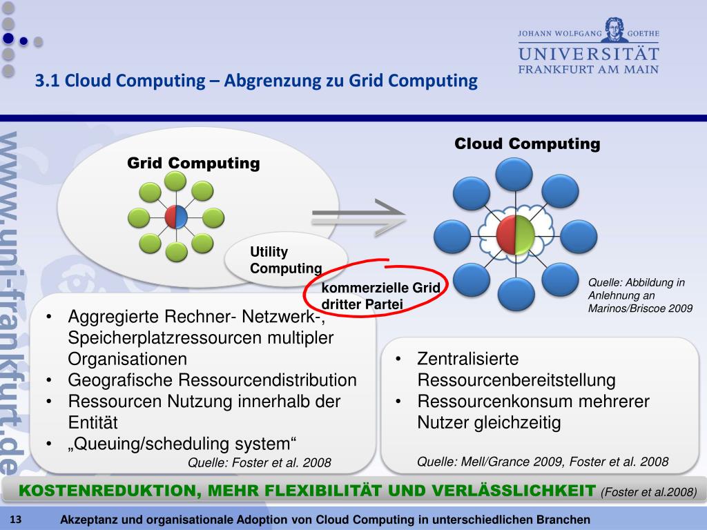 3.1 Cloud Computing – Abgrenzung zu Grid Computing Grid Computing Cloud Computing Utility Computing Quelle: Abbildung in Anlehnung an Marinos/Briscoe2009 kommerzielle Grid dritter Partei • Aggregierte Rechner- Netzwerk-, Speicherplatzressourcen multipler Organisationen • Geografische Ressourcendistribution • Ressourcen Nutzung innerhalb der Entität • „Queuing/schedulingsystem“ • Quelle: Foster et al. 2008 • Zentralisierte Ressourcenbereitstellung • Ressourcenkonsum mehrerer Nutzer gleichzeitig • Quelle: Mell/Grance 2009, Foster et al. 2008 KOSTENREDUKTION, MEHR FLEXIBILITÄT UND VERLÄSSLICHKEIT(Foster et al.2008)