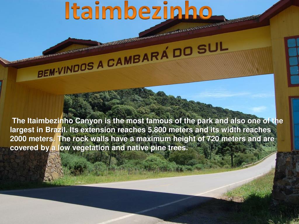 Itaimbezinho • The Itaimbezinho Canyon is the most famous of the park and also one of the largest in Brazil. Its extension reaches 5,800 meters and its width reaches 2000 meters. The rock walls have a maximum height of 720 meters and are covered by a low vegetation and native pine trees.