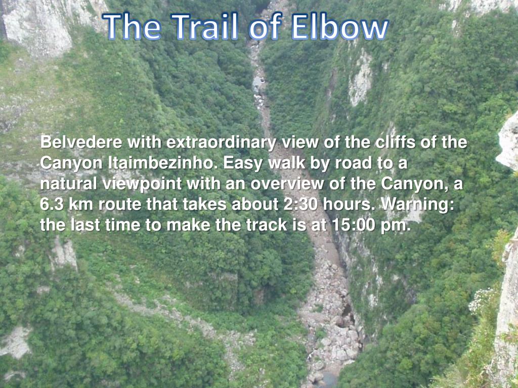 The Trail of Elbow • Belvedere with extraordinary view of the cliffs of the Canyon Itaimbezinho. Easy walk by road to a natural viewpoint with an overview of the Canyon, a 6.3 km route that takes about 2:30 hours. Warning: the last time to make the track is at 15:00 pm.