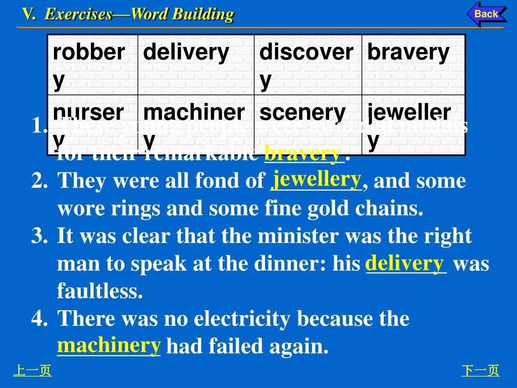 V. Exercises—Word Building Back • These young people were awarded medals for their remarkable _______. • They were all fond of ________, and some wore rings and some fine gold chains. • It was clear that the minister was the right man to speak at the dinner: his _______ was faultless. • There was no electricity because the _________ had failed again. bravery jewellery delivery machinery 上一页 下一页