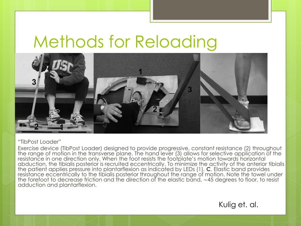 Reloading Research Kulig et. al-Jan 2009, RCT • 3 groups, 12 participants each: • Orthoses & stretching • Orthoses, stretching & concentric exercises • Orthoses, stretching & eccentric exercises • Inclusion Criteria: • pain for 3+ months • symptoms located at the medial ankle or foot • Tenderness to palpation specific to the tibialisposterior tendon • foot flattening • abducted midfoot • absence of rigid foot deformity