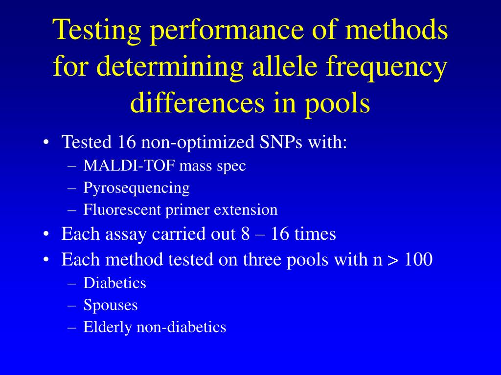 Testing performance of methods for determining allele frequency differences in pools • Tested 16 non-optimized SNPs with: • MALDI-TOF mass spec • Pyrosequencing • Fluorescent primer extension • Each assay carried out 8 – 16 times • Each method tested on three pools with n > 100 • Diabetics • Spouses • Elderly non-diabetics