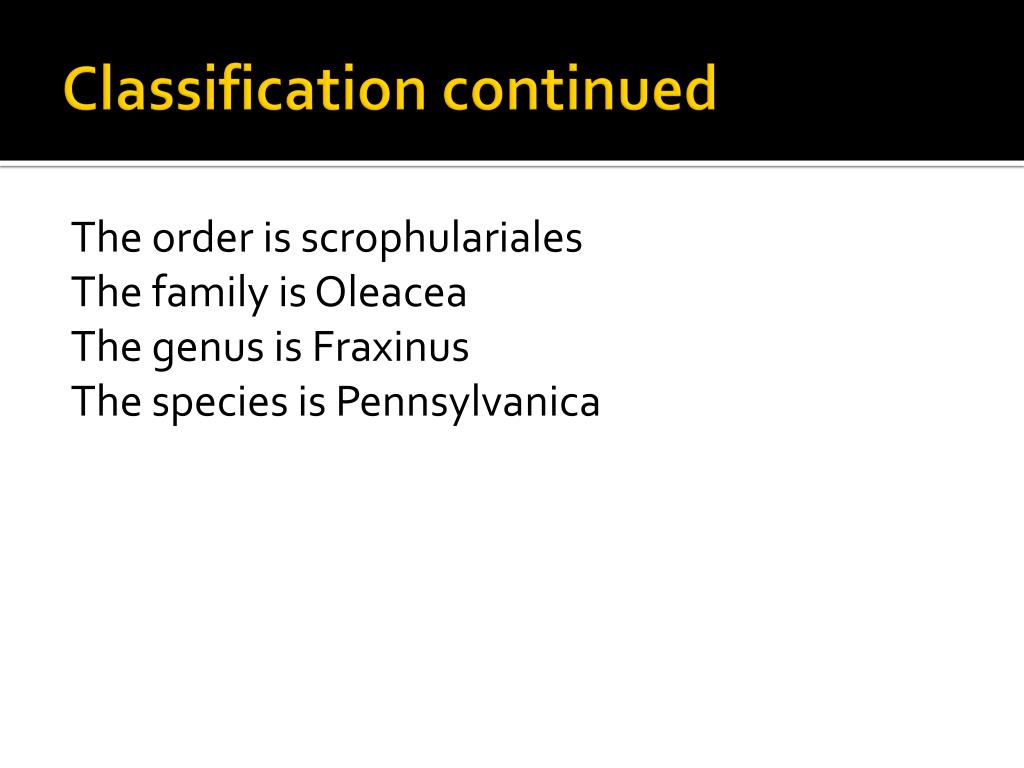 Classification continued The order is scrophulariales The family is Oleacea The genus is Fraxinus The species is Pennsylvanica