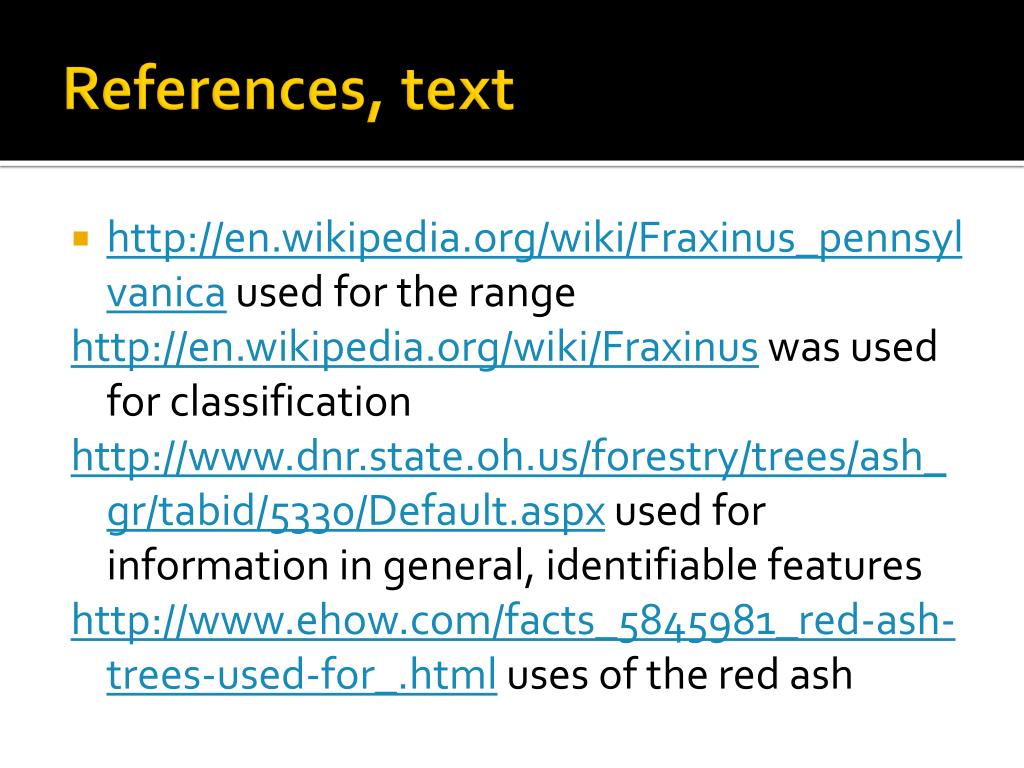 References, text • http://en.wikipedia.org/wiki/Fraxinus_pennsylvanica used for the range http://en.wikipedia.org/wiki/Fraxinus was used for classification http://www.dnr.state.oh.us/forestry/trees/ash_gr/tabid/5330/Default.aspx used for information in general, identifiable features http://www.ehow.com/facts_5845981_red-ash-trees-used-for_.html uses of the red ash