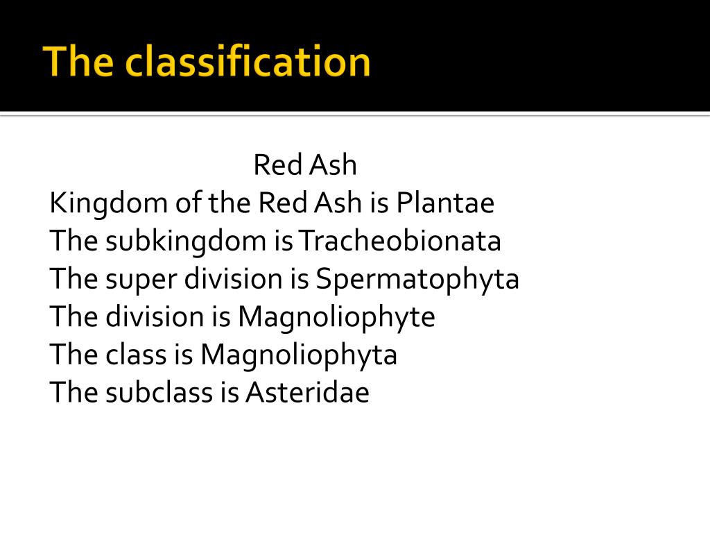The classification Red Ash Kingdom of the Red Ash is Plantae The subkingdom is Tracheobionata The super division is Spermatophyta The division is Magnoliophyte The class is Magnoliophyta The subclass is Asteridae