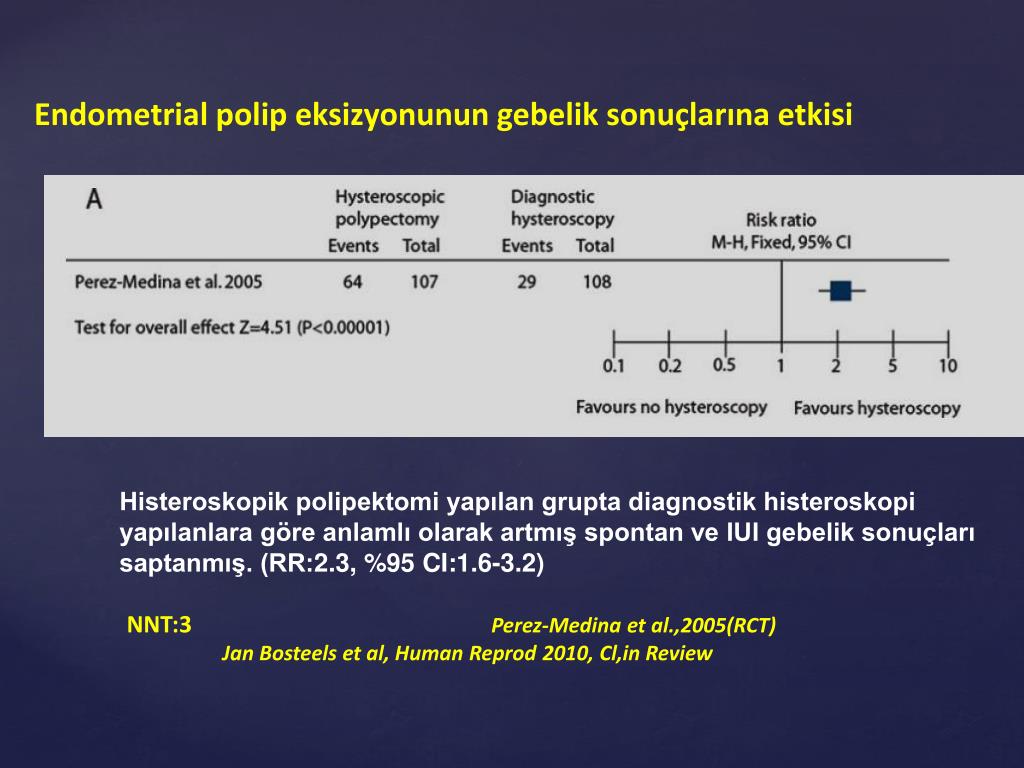 Endometrial polip eksizyonunun gebelik sonuçlarına etkisi Histeroskopik polipektomi yapılan grupta diagnostik histeroskopi yapılanlara göre anlamlı olarak artmış spontan ve IUI gebelik sonuçları saptanmış. (RR:2.3, %95 CI:1.6-3.2) NNT:3 Perez-Medina et al.,2005(RCT) Jan Bosteels et al, Human Reprod 2010, Cl,in Review