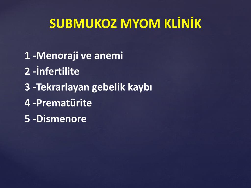 SUBMUKOZ MYOM KLİNİK 1 -Menoraji ve anemi 2 -İnfertilite 3 -Tekrarlayan gebelik kaybı 4 -Prematürite 5 -Dismenore