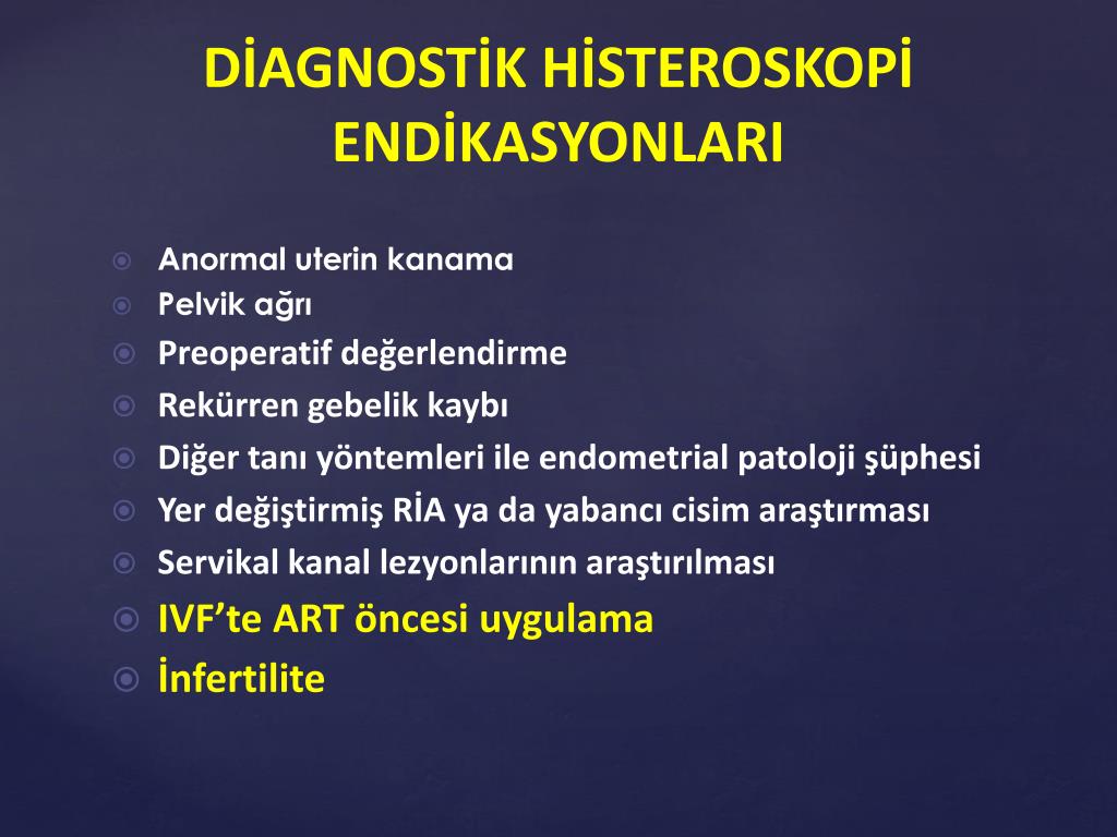 DİAGNOSTİK HİSTEROSKOPİ ENDİKASYONLARI • Anormal uterin kanama • Pelvik ağrı • Preoperatif değerlendirme • Rekürren gebelik kaybı • Diğer tanı yöntemleri ile endometrial patoloji şüphesi • Yer değiştirmiş RİA ya da yabancı cisim araştırması • Servikal kanal lezyonlarının araştırılması • IVF’te ART öncesi uygulama • İnfertilite