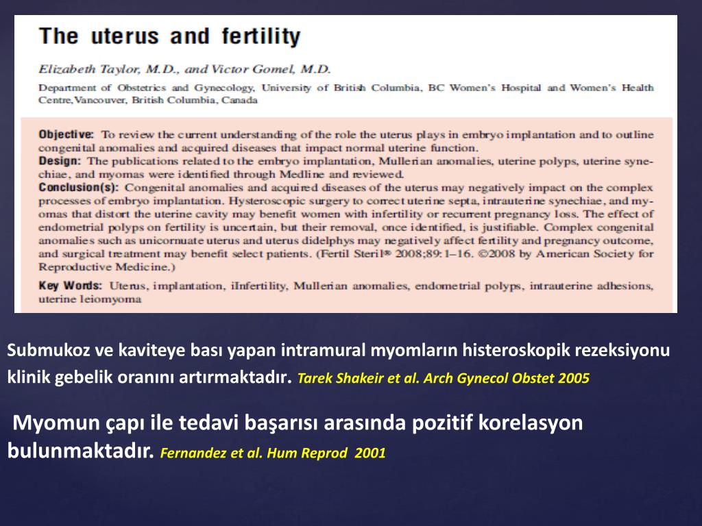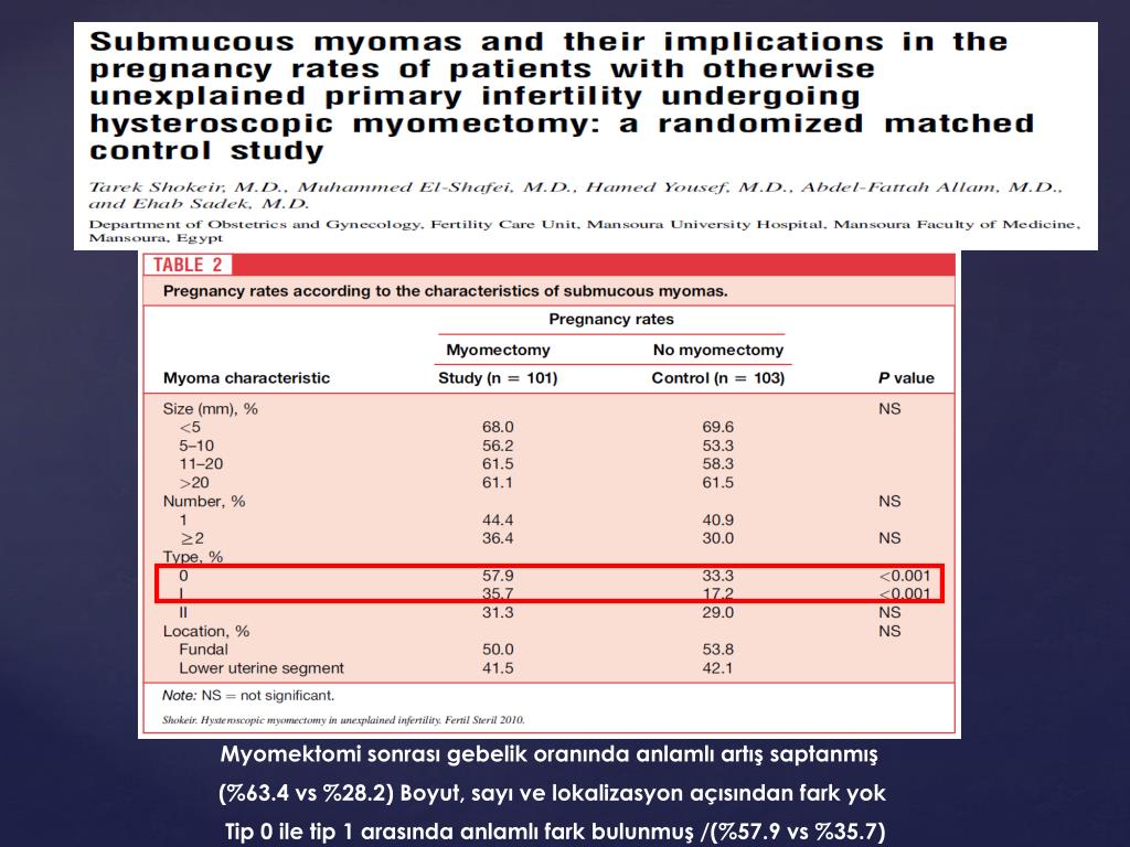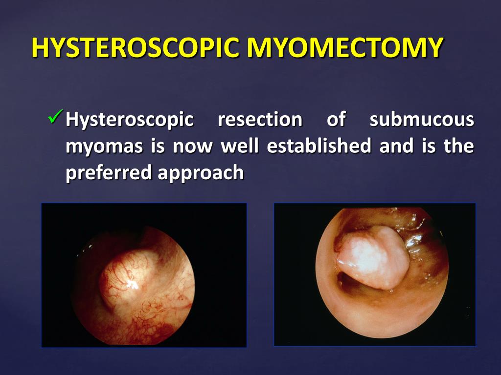 Submukoz ve kaviteye bası yapan intramuralmyomlarınhisteroskopik rezeksiyonu klinik gebelik oranını artırmaktadır.TarekShakeir et al. ArchGynecolObstet2005 Myomun çapı ile tedavi başarısı arasında pozitif korelasyon bulunmaktadır. Fernandez et al. Hum Reprod 2001