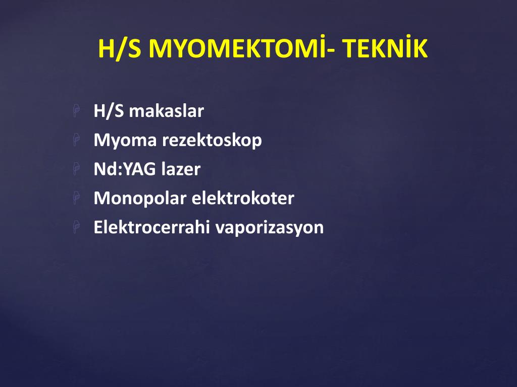 H/S makas • Myomresektoskop • Nd:YAG lazer • Monopolarelektrokoter • Elektro cerrahi vaporizayon H/S Myomektomi / teknik
