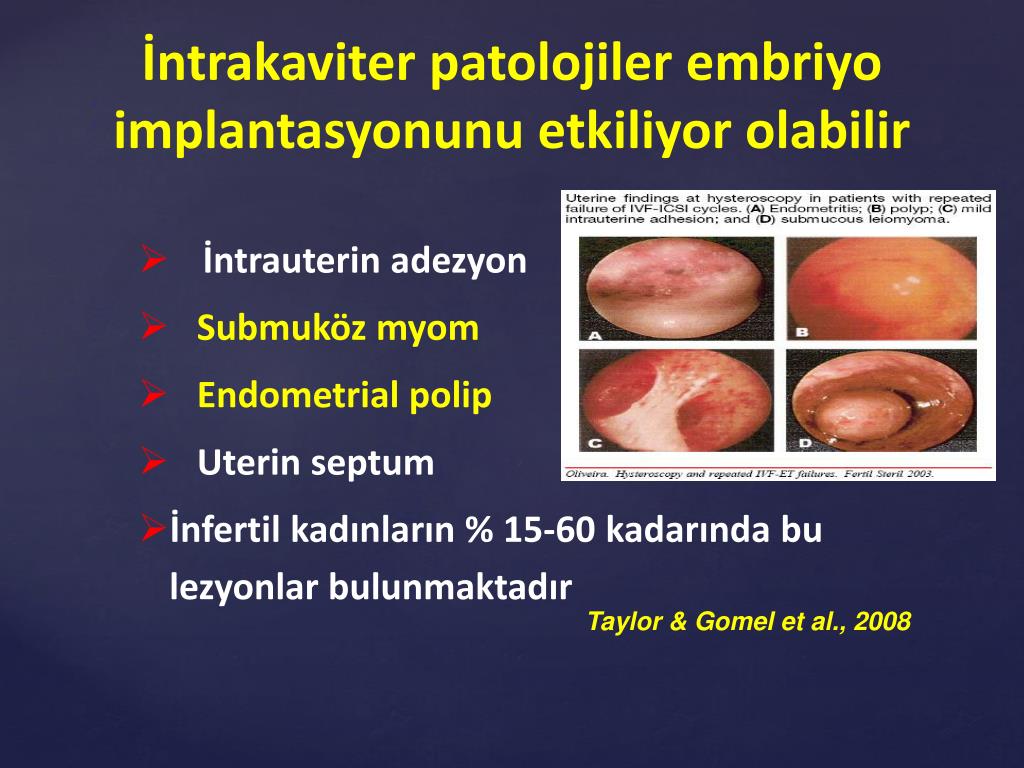 İntrakaviter patolojiler embriyo implantasyonunu etkiliyor olabilir ; • İntrauterin adezyon • Submuközmyom • Endometrial polip • Uterinseptum • İnfertil kadınların % 15-60 kadarında bu lezyonlar bulunmaktadır Taylor & Gomel et al., 2008