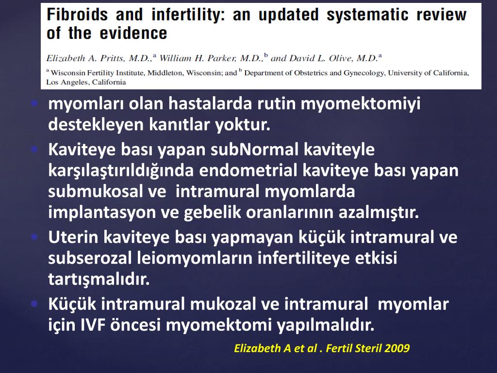 myomlarıolan hastalarda rutin myomektomiyi destekleyen kanıtlar yoktur. • Kaviteye bası yapan subNormalkaviteyle karşılaştırıldığında endometrialkaviteye bası yapan submukosal ve intramuralmyomlardaimplantasyon ve gebelik oranlarının azalmıştır. • Uterinkaviteye bası yapmayan küçük intramural ve subserozalleiomyomlarıninfertiliteye etkisi tartışmalıdır. • Küçük intramuralmukozalve intramuralmyomlar için IVF öncesi myomektomi yapılmalıdır. Elizabeth A et al . Fertil Steril 2009