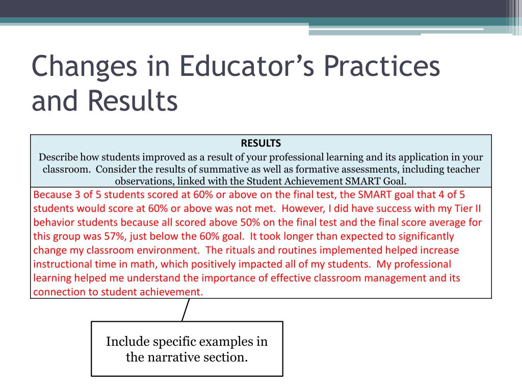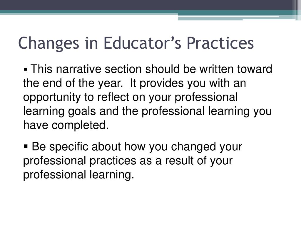 Changes in Educator’s Practices • This narrative section should be written toward the end of the year. It provides you with an opportunity to reflect on your professional learning goals and the professional learning you have completed. • Be specific about how you changed your professional practices as a result of your professional learning.