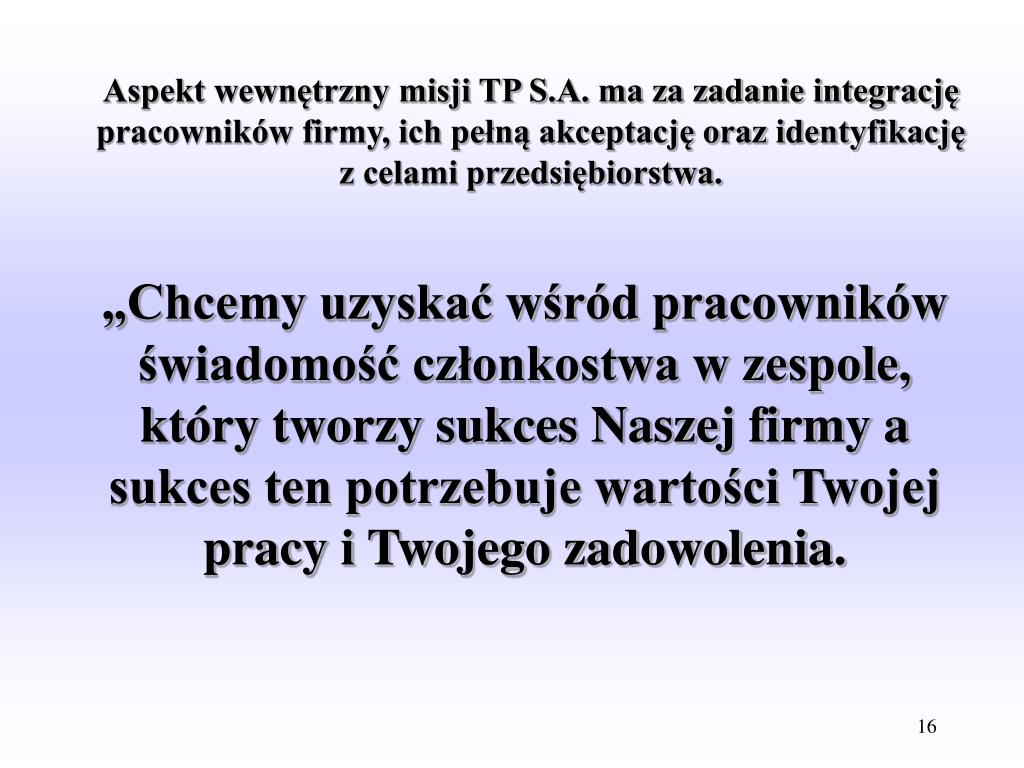 Aspekt wewnętrzny misji TP S.A. ma za zadanie integrację pracowników firmy, ich pełną akceptację oraz identyfikację z celami przedsiębiorstwa. „Chcemy uzyskać wśród pracowników świadomość członkostwa w zespole, który tworzy sukces Naszej firmy a sukces ten potrzebuje wartości Twojej pracy i Twojego zadowolenia.