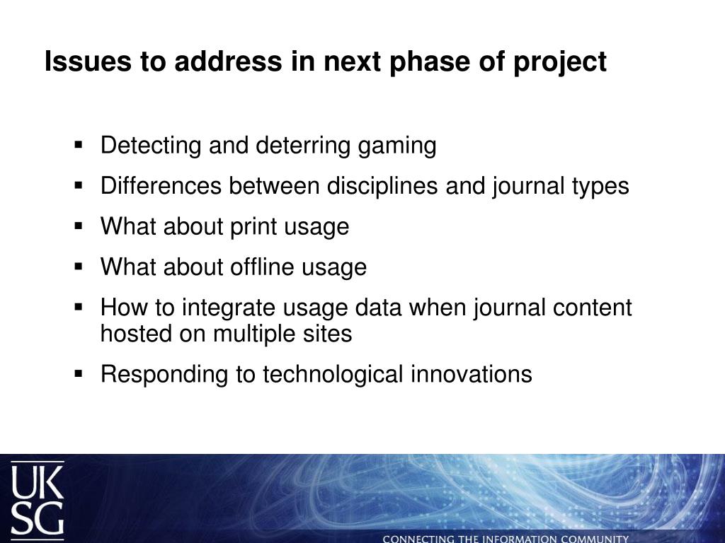 Issues to address in next phase of project • Detecting and deterring gaming • Differences between disciplines and journal types • What about print usage • What about offline usage • How to integrate usage data when journal content hosted on multiple sites • Responding to technological innovations