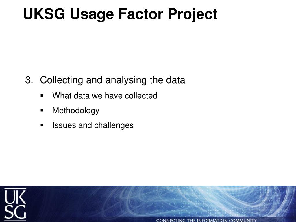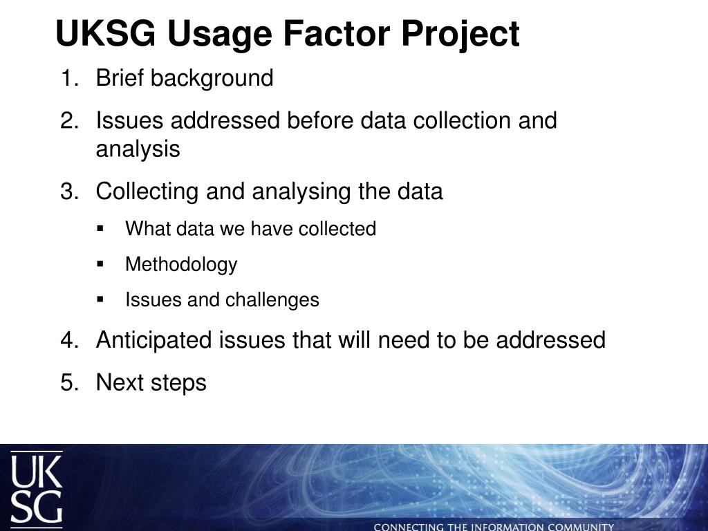 UKSG Usage Factor Project • Brief background • Issues addressed before data collection and analysis • Collecting and analysing the data • What data we have collected • Methodology • Issues and challenges • Anticipated issues that will need to be addressed • Next steps