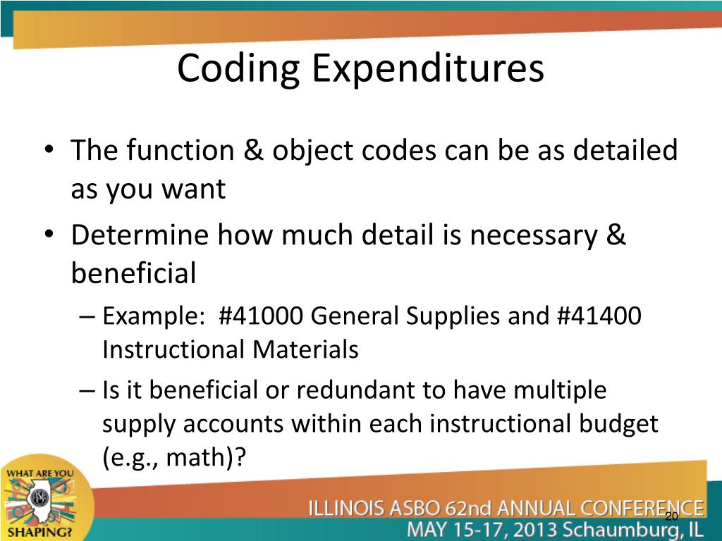 Coding Expenditures • The function & object codes can be as detailed as you want • Determine how much detail is necessary & beneficial • Example: #41000 General Supplies and #41400 Instructional Materials • Is it beneficial or redundant to have multiple supply accounts within each instructional budget (e.g., math)?