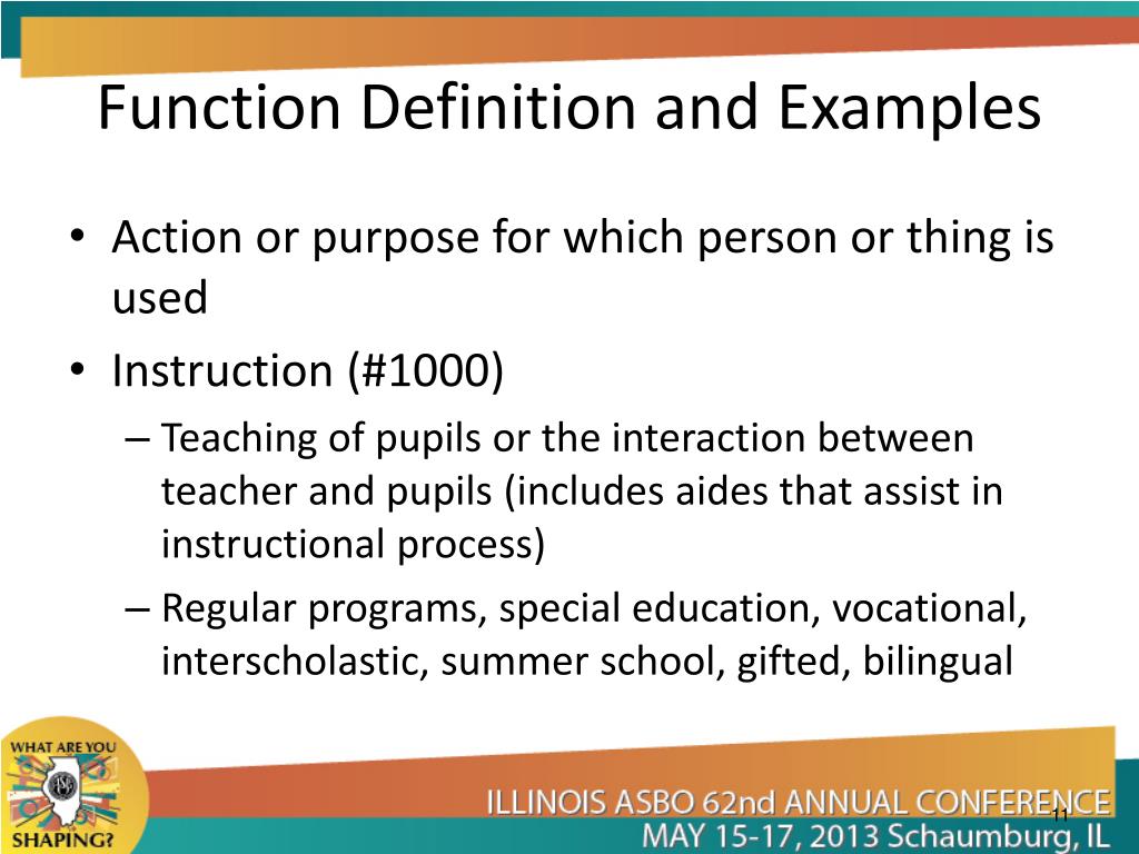 Function Definition and Examples • Action or purpose for which person or thing is used • Instruction (#1000) • Teaching of pupils or the interaction between teacher and pupils (includes aides that assist in instructional process) • Regular programs, special education, vocational, interscholastic, summer school, gifted, bilingual