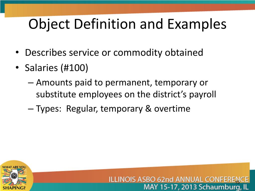 Object Definition and Examples • Describes service or commodity obtained • Salaries (#100) • Amounts paid to permanent, temporary or substitute employees on the district’s payroll • Types: Regular, temporary & overtime
