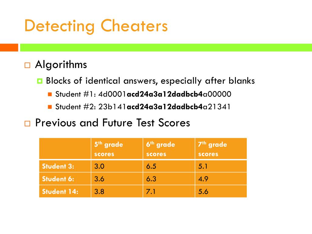 Detecting Cheaters • Algorithms • Blocks of identical answers, especially after blanks • Student #1: 4d0001acd24a3a12dadbcb4a00000 • Student #2: 23b141acd24a3a12dadbcb4a21341 • Previous and Future Test Scores