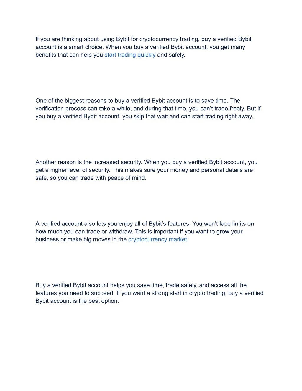 If you are thinking about using Bybit for cryptocurrency trading, buy a verified Bybit account is a smart choice. When you buy a verified Bybit account, you get many benefits that can help you start trading quickly and safely. One of the biggest reasons to buy a verified Bybit account is to save time. The verification process can take a while, and during that time, you can’t trade freely. But if you buy a verified Bybit account, you skip that wait and can start trading right away. Another reason is the increased security. When you buy a verified Bybit account, you get a higher level of security. This makes sure your money and personal details are safe, so you can trade with peace of mind. A verified account also lets you enjoy all of Bybit’s features. You won’t face limits on how much you can trade or withdraw. This is important if you want to grow your business or make big moves in the cryptocurrency market. Buy a verified Bybit account helps you save time, trade safely, and access all the features you need to succeed. If you want a strong start in crypto trading, buy a verified Bybit account is the best option.