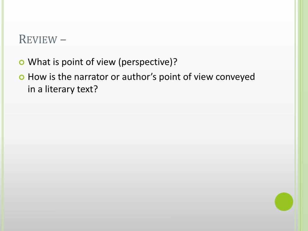 Review – • What is point of view (perspective)? • How is the narrator or author’s point of view conveyed in a literary text?