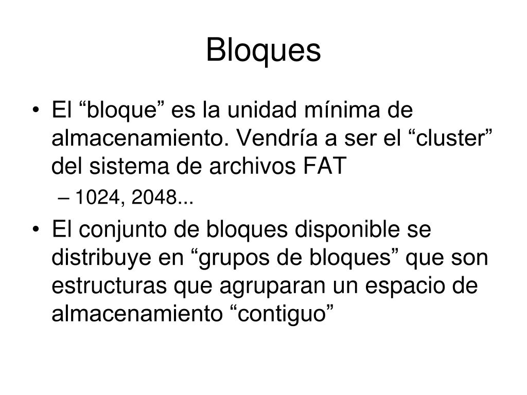 Bloques • El “bloque” es la unidad mínima de almacenamiento. Vendría a ser el “cluster” del sistema de archivos FAT • 1024, 2048... • El conjunto de bloques disponible se distribuye en “grupos de bloques” que son estructuras que agruparan un espacio de almacenamiento “contiguo”