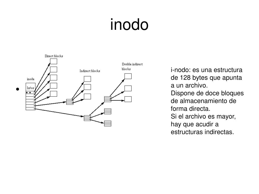 inodo • .. i-nodo: es una estructura de 128 bytes que apunta a un archivo. Dispone de doce bloques de almacenamiento de forma directa. Si el archivo es mayor, hay que acudir a estructuras indirectas.