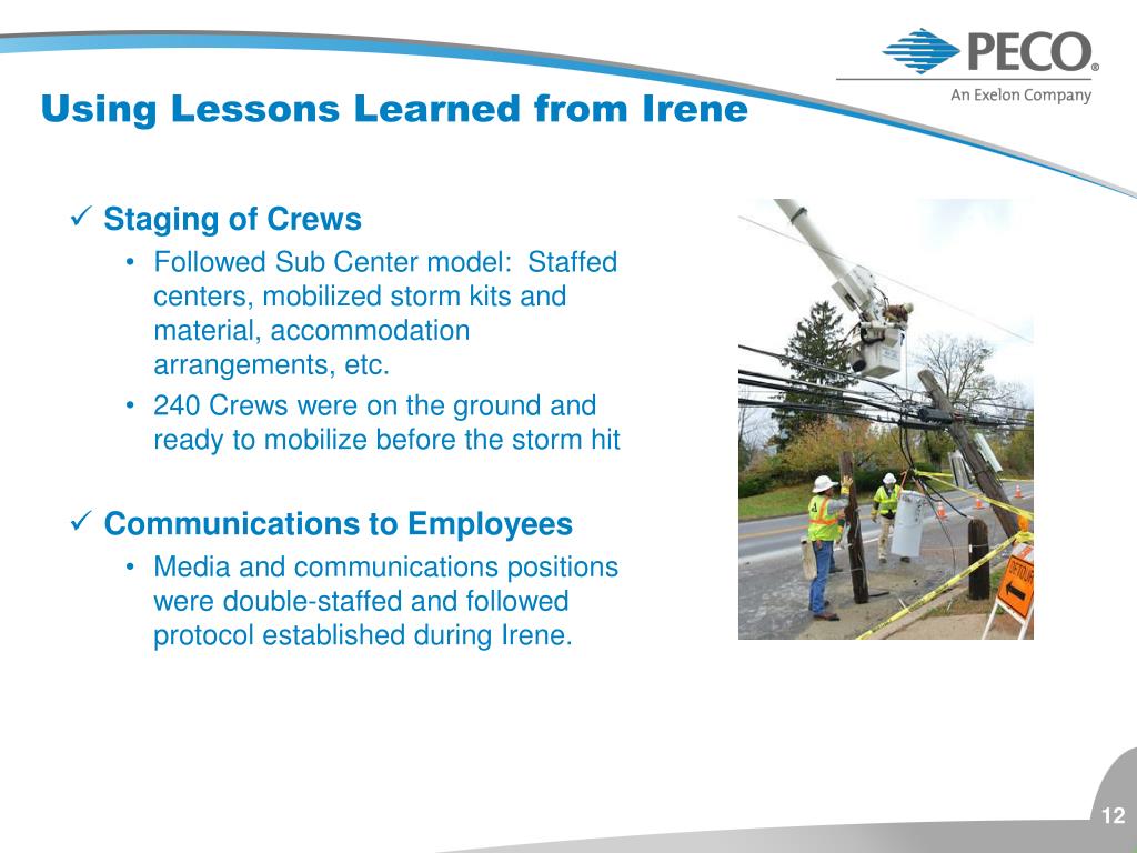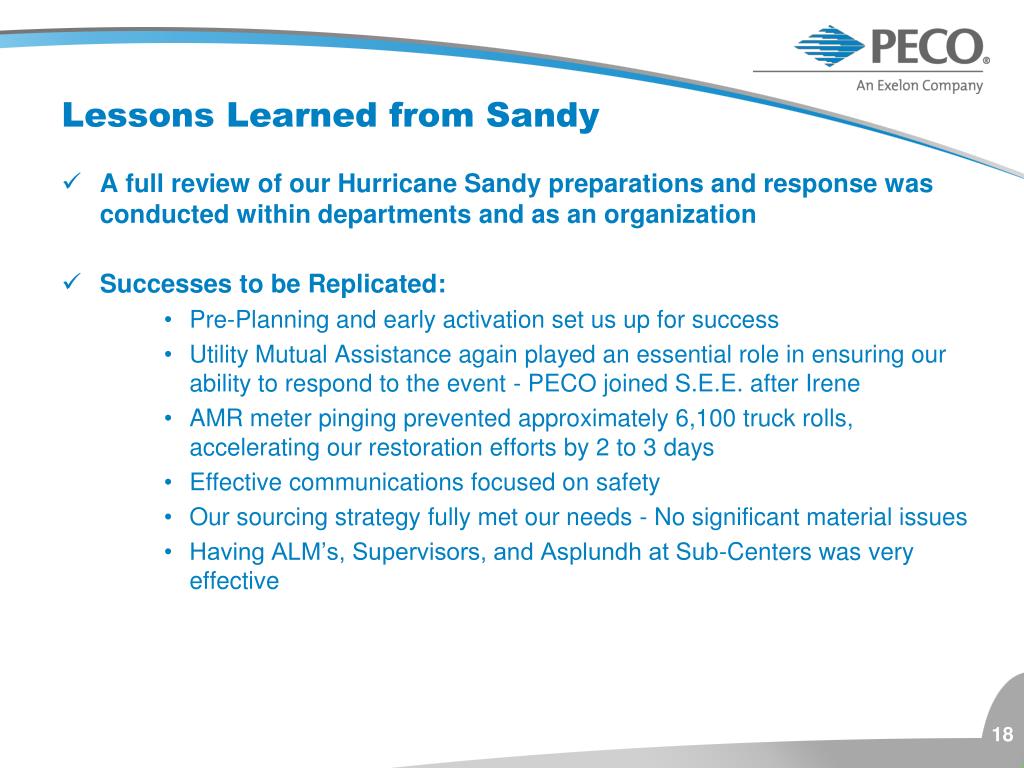 Lessons Learned from Sandy • A full review of our Hurricane Sandy preparations and response was conducted within departments and as an organization • Successes to be Replicated: • Pre-Planning and early activation set us up for success • Utility Mutual Assistance again played an essential role in ensuring our ability to respond to the event - PECO joined S.E.E. after Irene • AMR meter pinging prevented approximately 6,100 truck rolls, accelerating our restoration efforts by 2 to 3 days • Effective communications focused on safety • Our sourcing strategy fully met our needs - No significant material issues • Having ALM’s, Supervisors, and Asplundh at Sub-Centers was very effective
