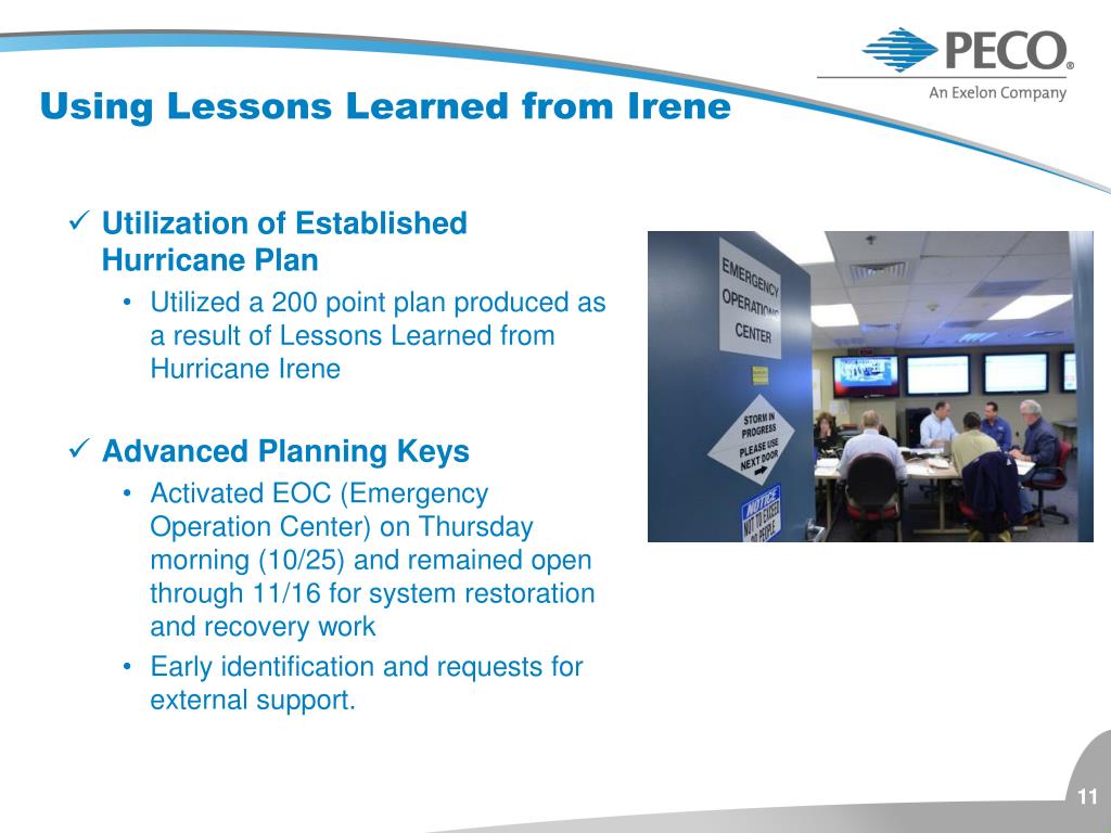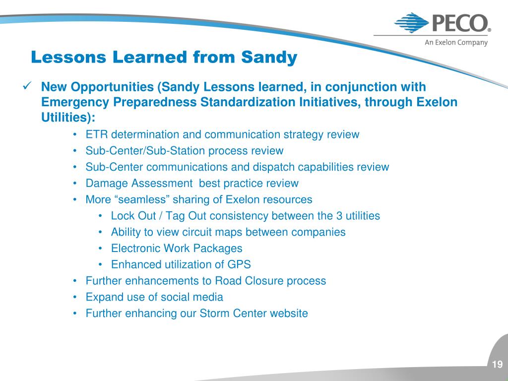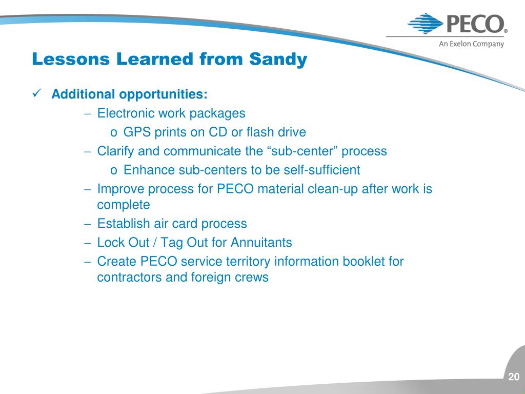 Lessons Learned from Sandy • Additional opportunities: • Electronic work packages • GPS prints on CD or flash drive • Clarify and communicate the “sub-center” process • Enhance sub-centers to be self-sufficient • Improve process for PECO material clean-up after work is complete • Establish air card process • Lock Out / Tag Out for Annuitants • Create PECO service territory information booklet for contractors and foreign crews