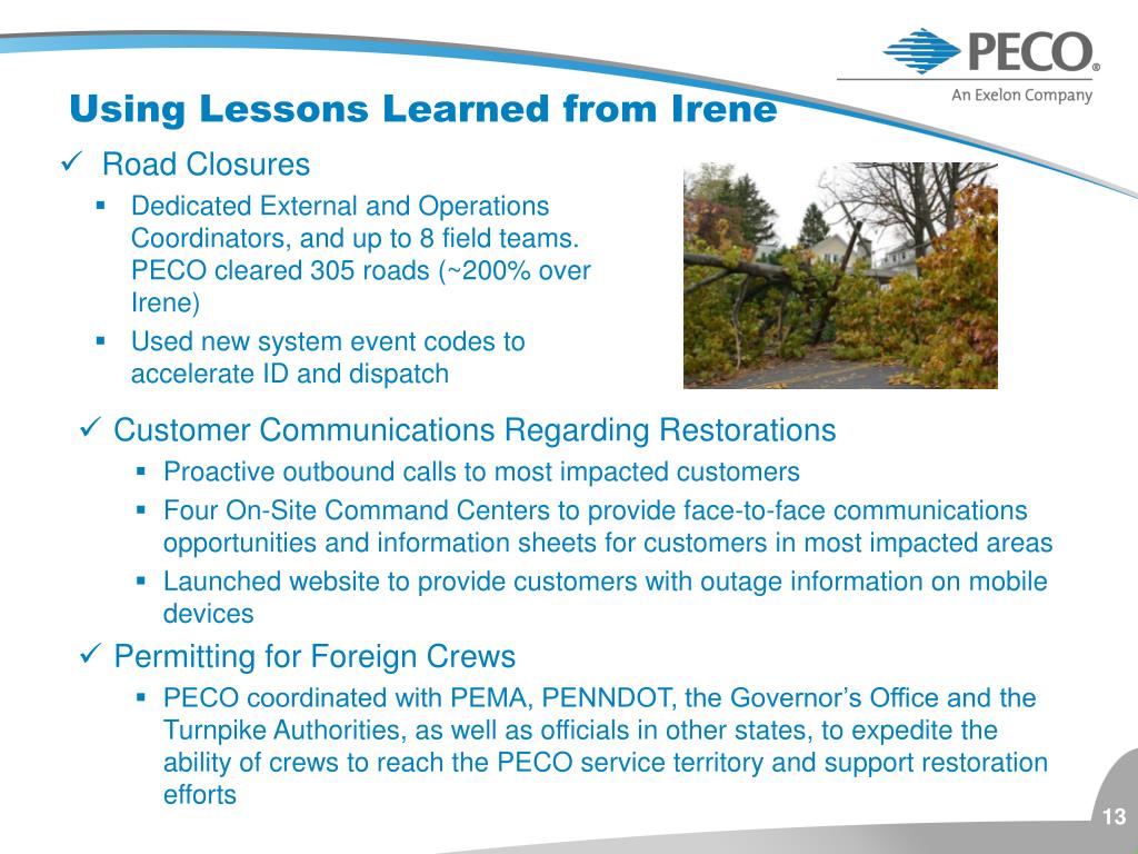 Using Lessons Learned from Irene • Road Closures • Dedicated External and Operations Coordinators, and up to 8 field teams. PECO cleared 305 roads (~200% over Irene) • Used new system event codes to accelerate ID and dispatch • Customer Communications Regarding Restorations • Proactive outbound calls to most impacted customers • Four On-Site Command Centers to provide face-to-face communications opportunities and information sheets for customers in most impacted areas • Launched website to provide customers with outage information on mobile devices • Permitting for Foreign Crews • PECO coordinated with PEMA, PENNDOT, the Governor’s Office and the Turnpike Authorities, as well as officials in other states, to expedite the ability of crews to reach the PECO service territory and support restoration efforts