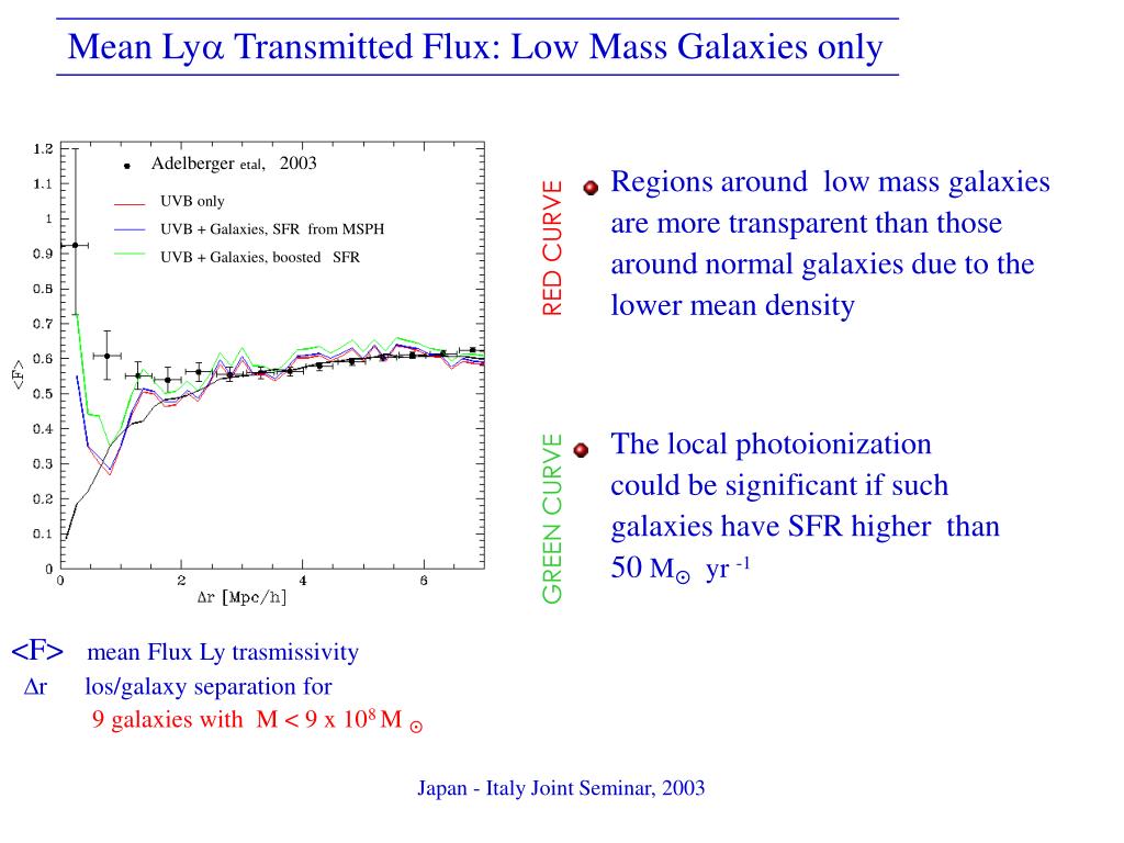 Regions around low mass galaxies are more transparent than those around normal galaxies due to the lower mean density RED CURVE Adelberger etal, 2003 UVB only UVB + Galaxies, SFR from MSPH UVB + Galaxies, boosted SFR The local photoionization could be significant if such galaxies have SFR higher than 50 M yr -1 GREEN CURVE Mean Ly Transmitted Flux: Low Mass Galaxies only <F> mean Flux Ly trasmissivity r los/galaxy separation for 9 galaxies with M < 9 x 108 M Japan - Italy Joint Seminar, 2003