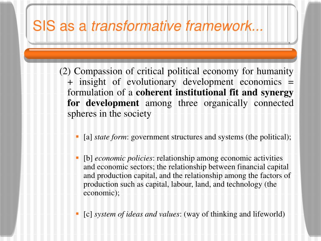 SIS as a transformative framework... (2) Compassion of critical political economy for humanity + insight of evolutionary development economics = formulation of a coherent institutional fit and synergy for development among three organically connected spheres in the society • [a] state form: government structures and systems (the political); • [b] economic policies:relationship among economic activities and economic sectors; the relationship between financial capital and production capital, and the relationship among the factors of production such as capital, labour, land, and technology (the economic); • [c] system of ideas and values:(way of thinking and lifeworld)