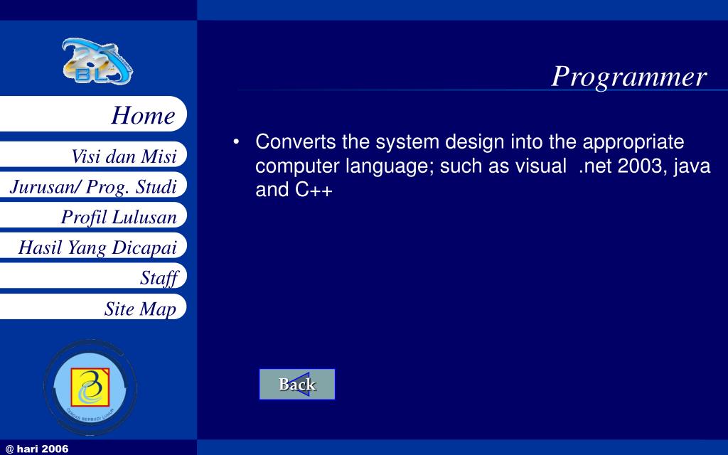 Programmer • Converts the system design into the appropriate computer language; such as visual .net 2003, java and C++ Back