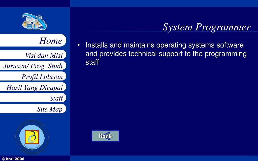 System Programmer • Installs and maintains operating systems software and provides technical support to the programming staff Back