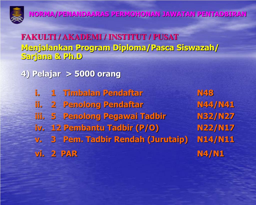 NORMA/PENANDAARAS PERMOHONAN JAWATAN PENTADBIRAN FAKULTI / AKADEMI / INSTITUT / PUSAT Menjalankan Program Diploma/Pasca Siswazah/ Sarjana & Ph.D 4) Pelajar > 5000 orang i. 1 Timbalan Pendaftar N48 ii. 2 Penolong Pendaftar N44/N41 iii. 5 Penolong Pegawai Tadbir N32/N27 iv. 12 Pembantu Tadbir (P/O) N22/N17 v. 3 Pem. Tadbir Rendah (Jurutaip) N14/N11 vi. 2 PAR N4/N1
