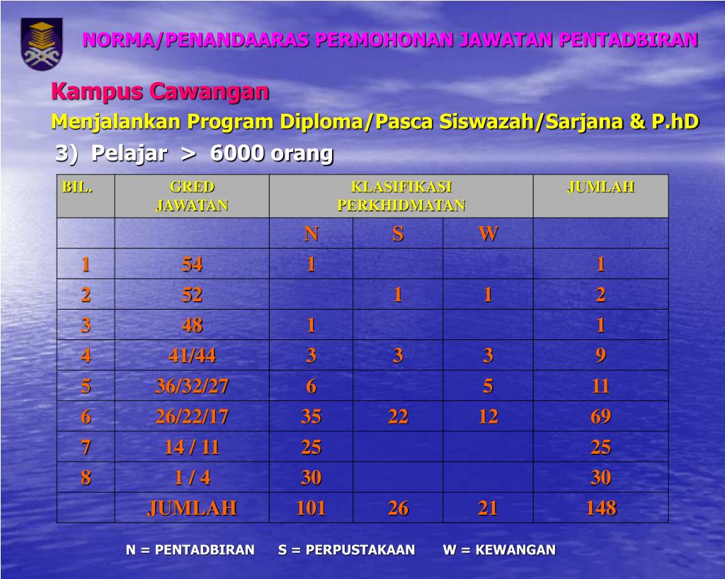 NORMA/PENANDAARAS PERMOHONAN JAWATAN PENTADBIRAN Kampus Cawangan Menjalankan Program Diploma/Pasca Siswazah/Sarjana & P.hD 2) Pelajar > 4000 orang N = PENTADBIRAN S = PERPUSTAKAAN W = KEWANGAN
